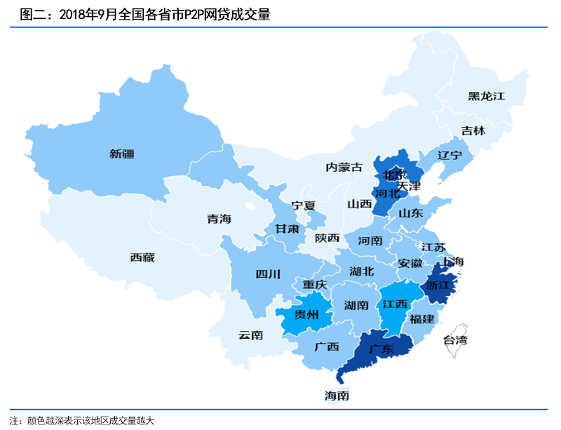 从各省市P2P网贷的成交情况来看,进入统计的30个省市中,9月有13个省市的P2P网贷成交量环比上升。成交量排名全国前三位的是北京、上海和广东,9月的成交量分别为355.01亿元、289.38亿元和271.65亿元。
