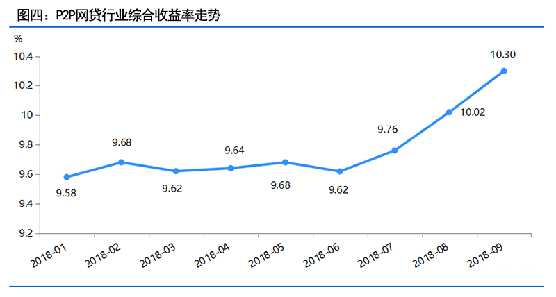 2018年9月,网贷行业综合收益率为10.30%,创近两年新高,环比上升28个基点(1个基点=0.01%),同比上升77个基点。本月综合收益率继续走高,主要是因为近期出借人投资活跃度相对较低,平台为留存存量并获取新用户,增加用户粘性,不少平台进行了加息活动。