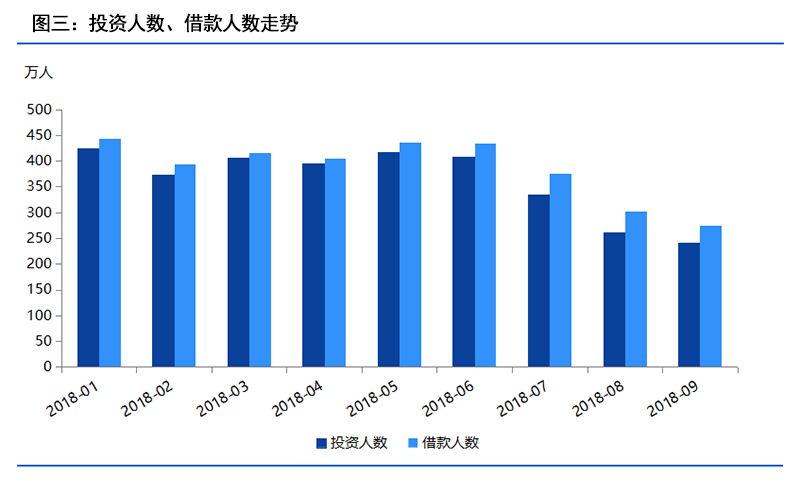 9月P2P网贷行业的活跃投资人数、活跃借款人数分别为241.64万人、274.35万人,其中活跃投资人数环比下降7.25%,活跃借款人数环比下降9.08%。由于投资人仍然以谨慎、观望为主,使得投资人数出现下滑。本月投资人数和借款人数虽然仍然出现下降,但是下降幅度相比上月已经有所缓解。
