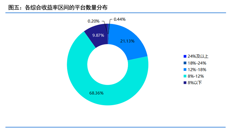 主流综合收益率区间仍分布在8%-12%,平台占比为68.36%,较上月上升0.44个百分点;其次为综合收益率在12%-18%的平台,占比为21.13%,8%以下低息平台占比有所上升,为9.87%,24%及以上的高息平台占比仅为0.20%。
