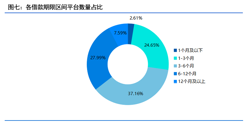 从P2P网贷平台平均借款期限的分布上看,64.42%的平台平均借款期限在半年以内。其中1-3个月区间的平台占比为24.65%,环比上升4.01个百分点;3-6个月区间的平台占比为37.16%,环比下降了2.19个百分点。12个月及以上的平台占比为7.59%,环比下降了0.73个百分点。